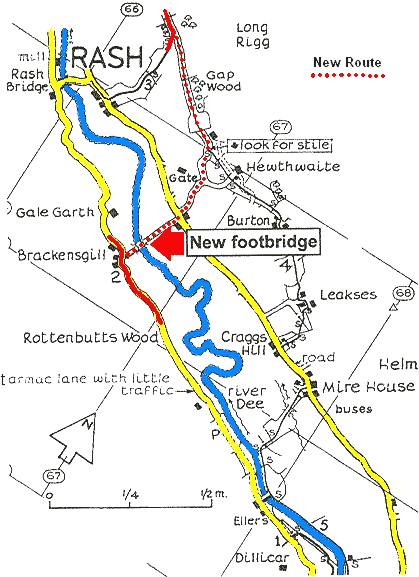A few years ago the route of the Dales Way was revised downstream from Dent in order to avoid the road walking between Ellers Bridge and Rash. However since that time a completely new footbridge has been constructed at Brackensgill, where there was previously only a deep ford. The official route of the Dales Way has now been changed to make use of this. So do not cross Ellers Bridge, but continue along the lane down the SW side of the dale until the bridleway leading to Brackensgill Bridge can be followed down to the river. Short stretches of footpath have been created to give access to the bridge. Continuing, the main valley road is crossed almost directly to climb on another bridleway up the other side of the dale and, after a left fork, one duly joins the contouring track to rejoin the original route above Rash. This route is very clearly shown on the Explorer (Outdoor Leisure) map. It should be noted that this is now the official and recommended route, but the original route and the diversion from Ellers Bridge are on rights of way and can still be used if preferred.