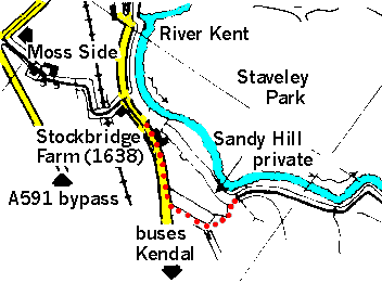 A diversion has taken place, which affects the route of the Dales Way at Staveley. This may not yet be noted in some guidebooks. On approaching Staveley from the Burneside direction, the route no longer follows the walled track all the way to Sandy Hill Farm but bears left up to the road. This is well signed and waymarked.